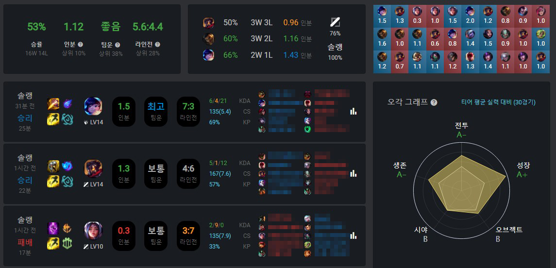 유어지지에 가장 유명한 내용으로 본인의 팀운을 확인할 수 있어요. 뿐만 아니라 게임에서 몇 인분 했는지, 라인전은 얼마나 잘했는지도 볼 수 있는데요. 확실한 지표는 아니니까 재미 용도로만 봐주시면 될 것 같아요.