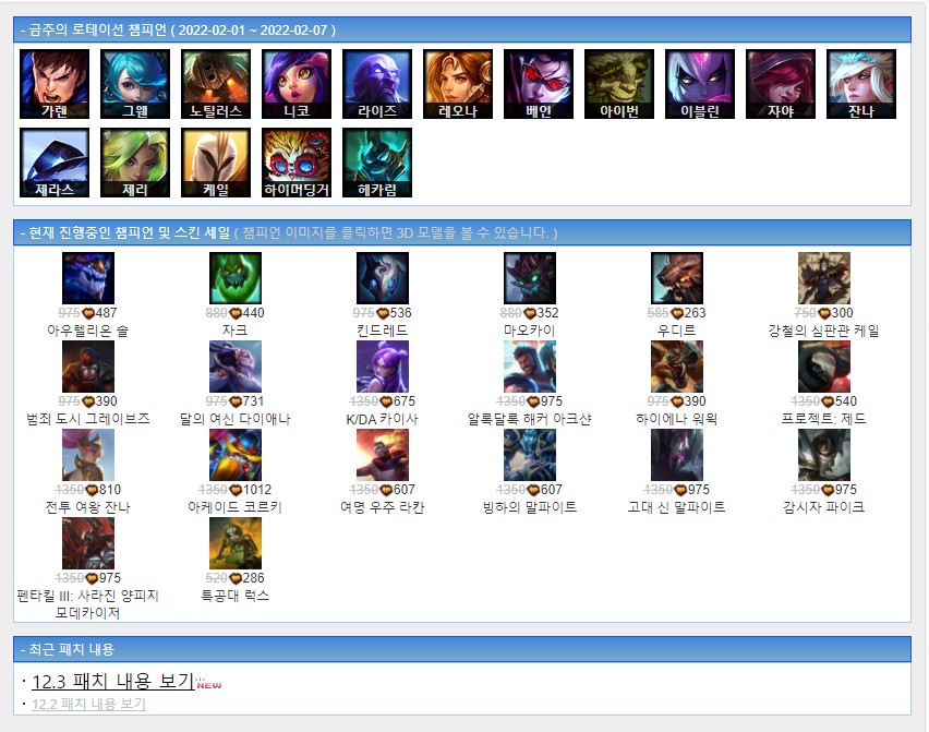 진행 중인 로테이션 챔피언과 세일 정보, 심지어 최근 패치 내용까지 확인할 수 있다는 점은 좋아요.